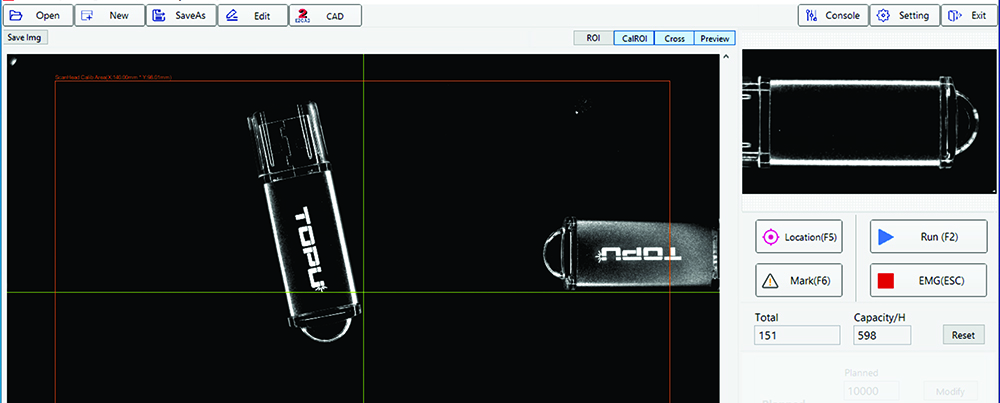 The vision software can detect the processed object by high resolution camera, and then compare with the original set one. If match with the original one, then laser marking will be output automatically, and makes the marking location and marking direction correctly